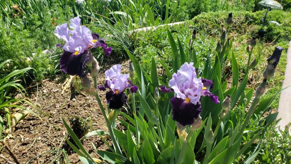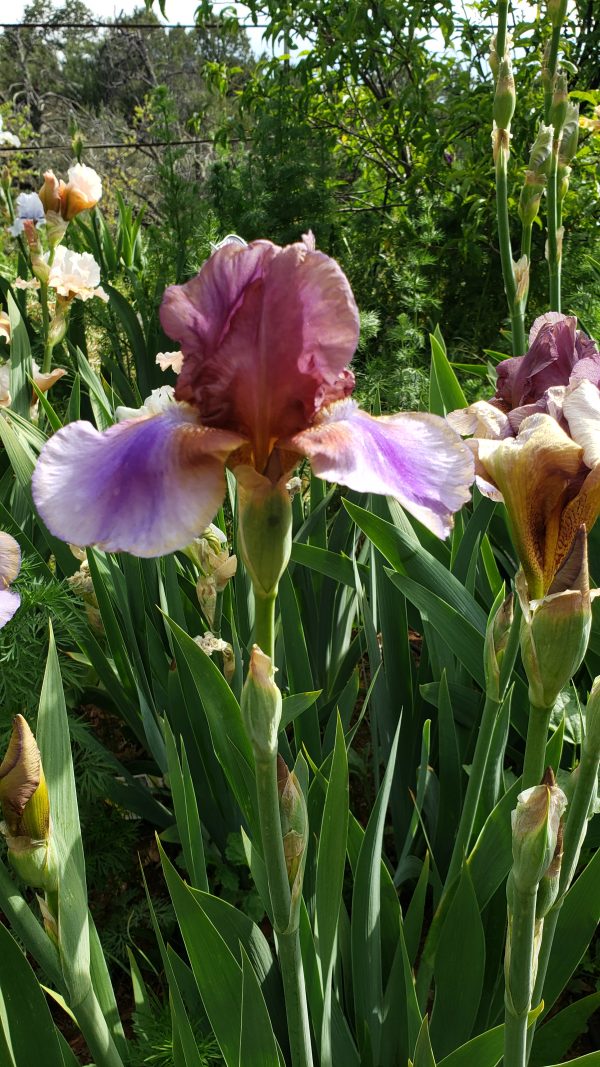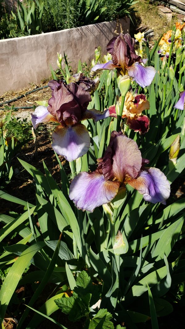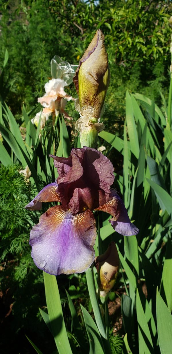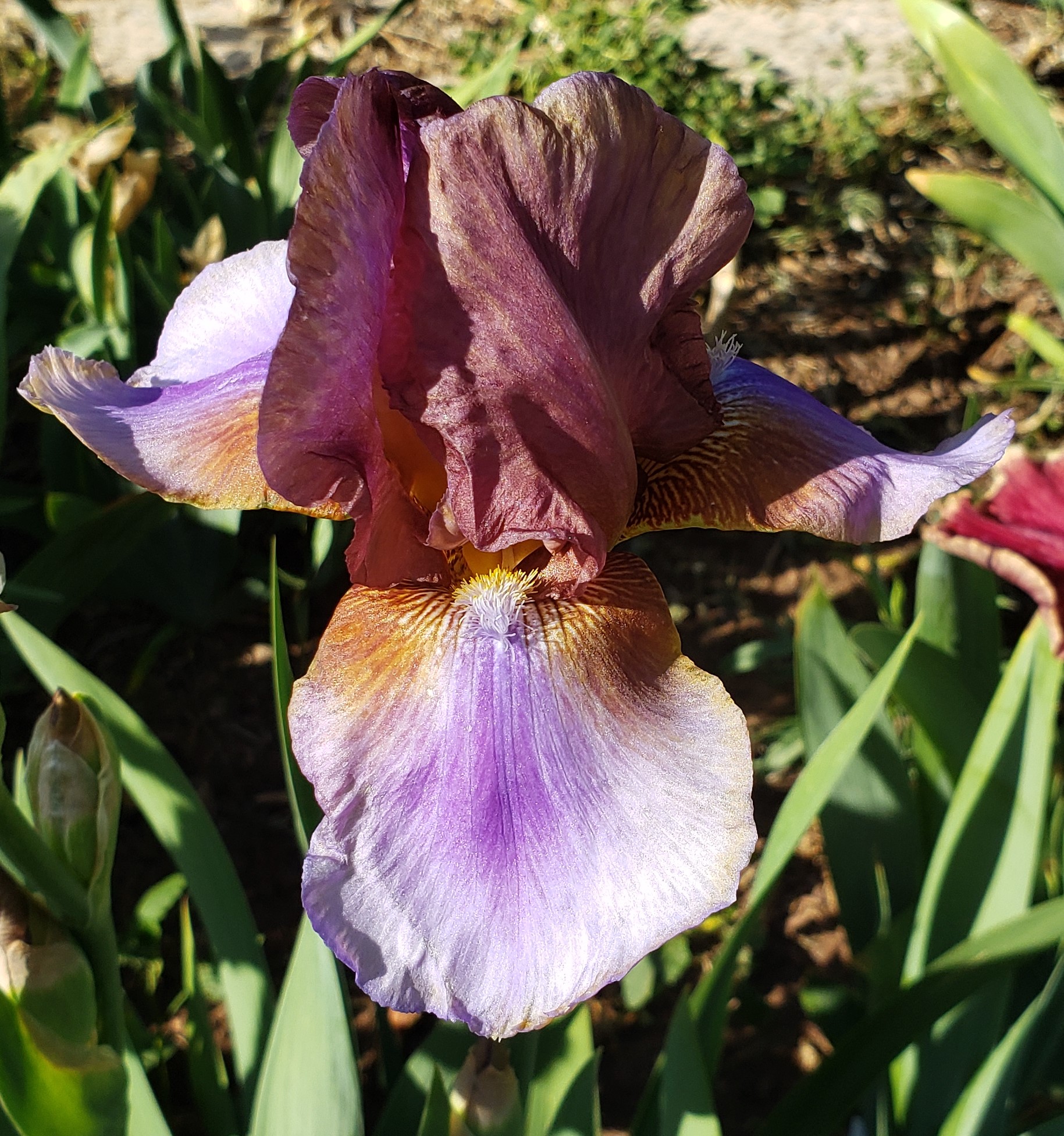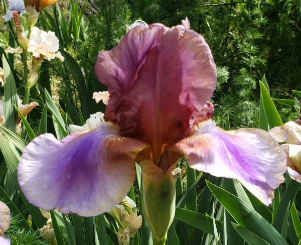 ‘Burnt Toffee’ (Schreiner, R. 1977). Seedling# G 1519-3. TB, 37″ (94 cm). Late midseason bloom. Standarads light chocolate, flushed blue-lavender to center along midrib; falls richer chocolate with darker chocolate hafts, blue blaze in center; dull gold to blue beard.