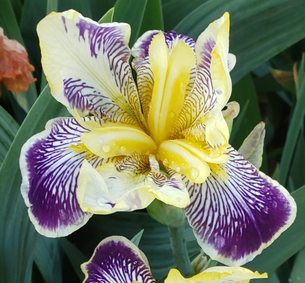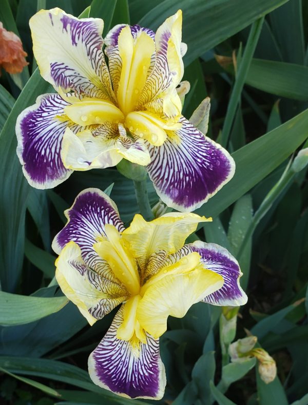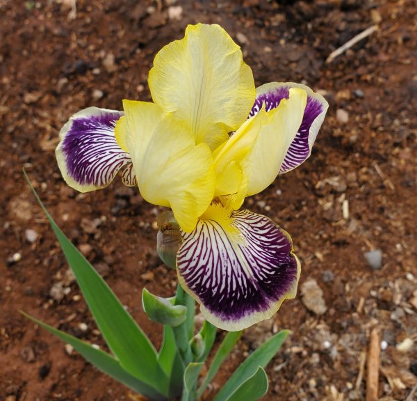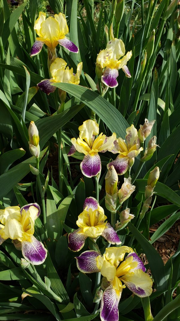 IB – Intermediate Bearded Iris stand from 16 inches (41 cm) to 27 1/2 inches (70 cm) high, with their bloom season overlapping the SBDs and the TBs. Although the IBs show their dwarf ancestry in early bloom season and very interesting color patterns, they are large enough that their individual stalks may be nicely branched, forming an elegant bouquet. Some varieties are nicest in clumps, where they present a large amount of color (like the SDBs), while others are showiest in specimen plantings, where the stalks and individual blooms may be seen to best advantage.