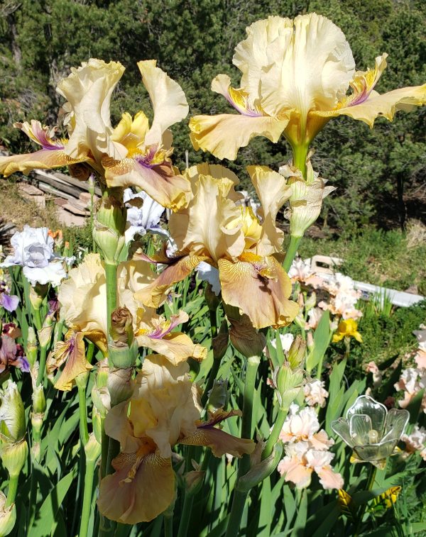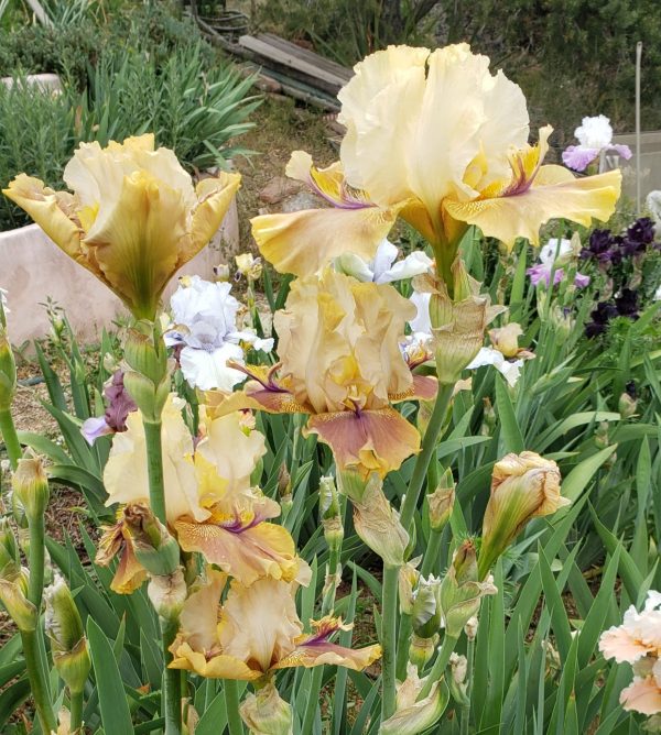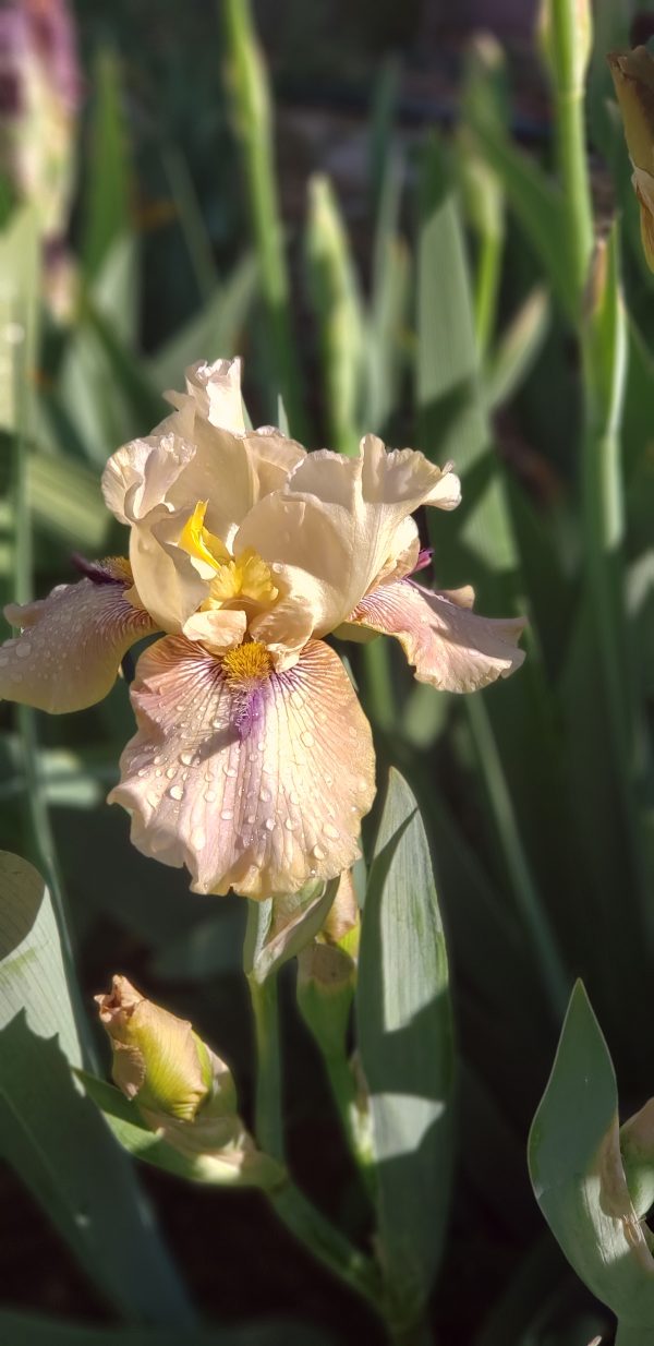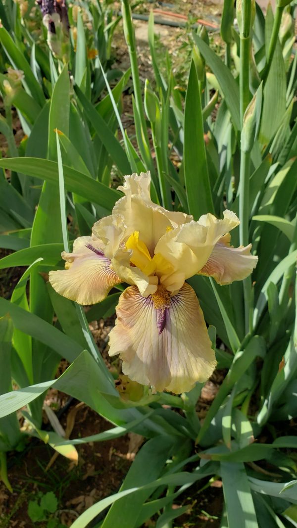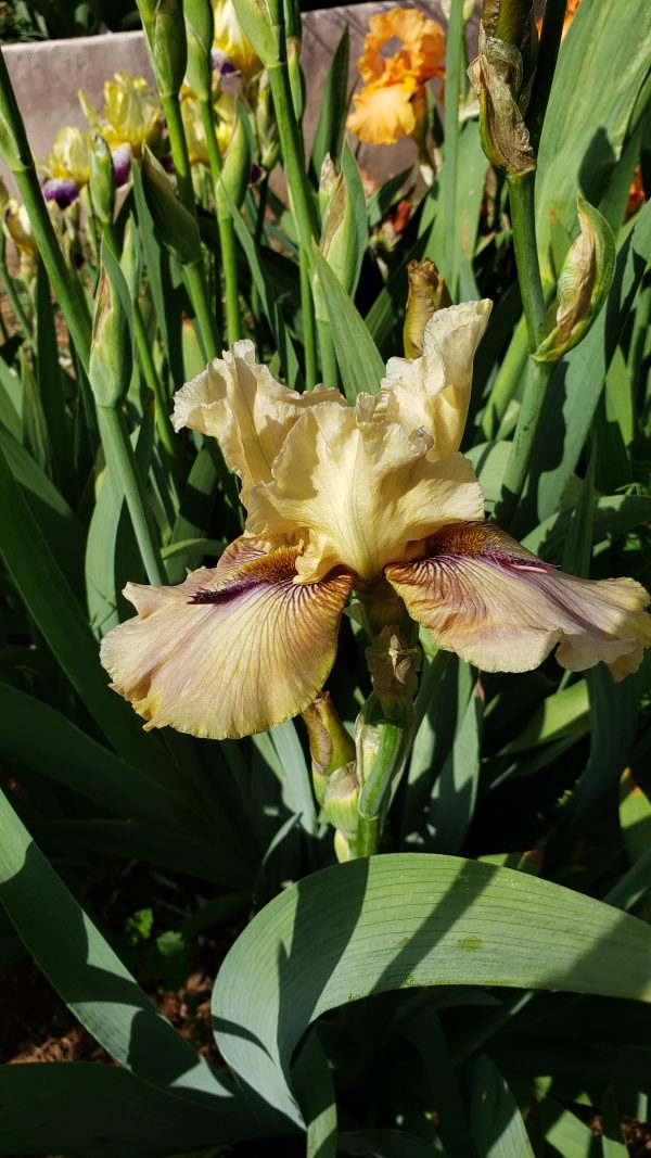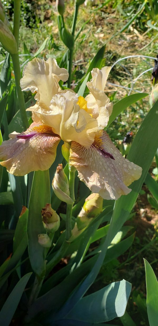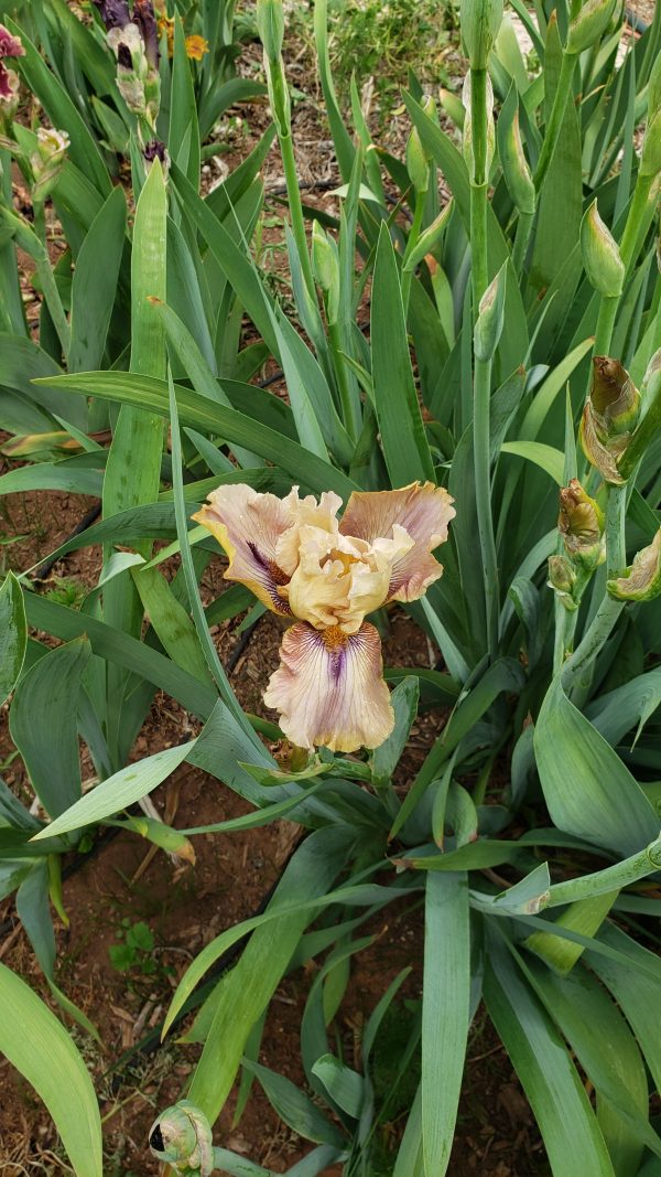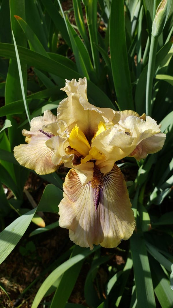 ‘Thornbird’ (Monty Byers, R. 1988). Seedling# D156-1-B. TB, height 35″ (89 cm), Midseason bloom. Standards pale ecru; falls greenish tan, deeper at hafts which are overlaid with deep violet lines radiating out from around beard and suffusing into center; violet beard tipped mustard, violet horns or spoons; lightly ruffled; slight sweet fragrance.